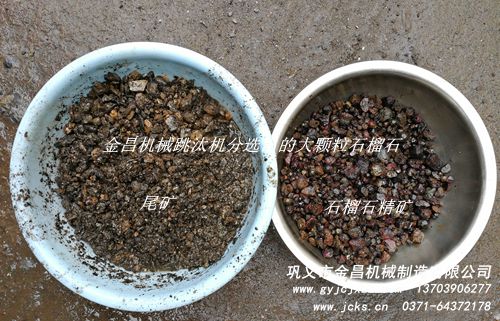 因為石榴石的比重較大,而脈石的比重較小,兩者有很明顯的比重差,跳汰機正是根據物體比重差進行分選的設備,效果是很不錯的。下邊圖片是鞏義市金昌機械用跳汰機分選出的石榴石效果,您可以參考一下。