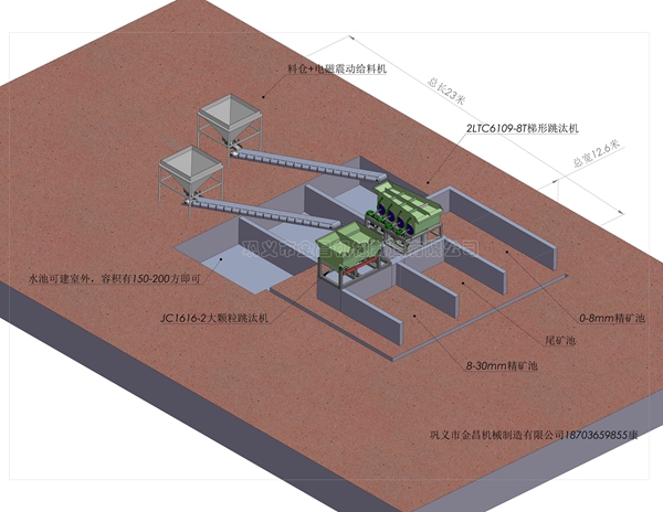 鞏義市金昌機械專業(yè)生產跳汰機設備,今天為大家介紹兩種常用的跳汰機設備。一種是2LTC6109-8T梯形跳汰機,一種是JC1616-2大顆粒跳汰機。前者是分選0-8毫米之間的螢石礦,后者是分選8-30毫米之間的螢石礦,單臺每個小時處理量都在20-30噸之間,如果是選其它的礦物,處理量會更大一些。前者是下排料跳汰機,也就是精礦從跳汰機肚子下邊出,后者是篩上排礦的跳汰機,精礦和尾礦都從跳汰機上邊出。兩種跳汰機是黃金搭檔,使用的朋友也比較大,大體怎樣布局您可以參考一下下圖,希望對您有幫助。