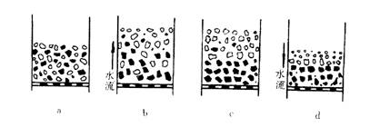 c—顆粒在水中沉降分層;d—水流下降,床層密集,重礦物進(jìn)入底層