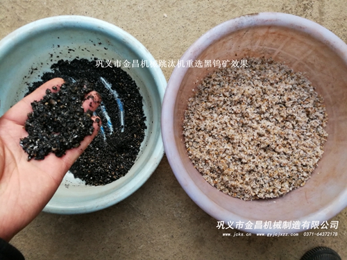 觀察礦石可知,黑鎢礦和石英不存在共生的問(wèn)題,只需要將礦石破碎到一定粒度以后,用篩子篩分后,直接進(jìn)入跳汰機(jī)重選就可以,實(shí)踐證明跳汰機(jī)重選黑鎢礦效果還是不錯(cuò)的,下邊圖片和視頻是鞏義市金昌機(jī)械實(shí)驗(yàn)過(guò)程。