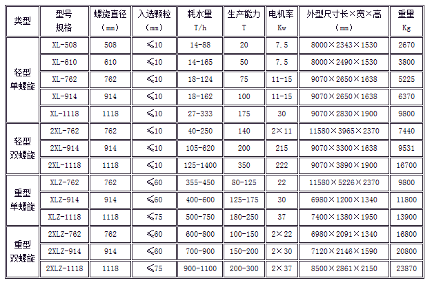 | 規(guī)格型號 | 螺旋直徑(mm) | 產(chǎn)量(t) | 電動機功率(kw) | 機重(kg) |